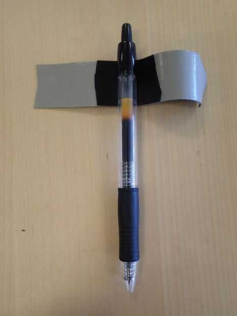 1. Deslice uno de los conjuntos de la cinta por debajo del clip de la pluma con la parte adhesiva hacia el clip, hacia el cuerpo de la pluma y centro de la pluma en la cinta.