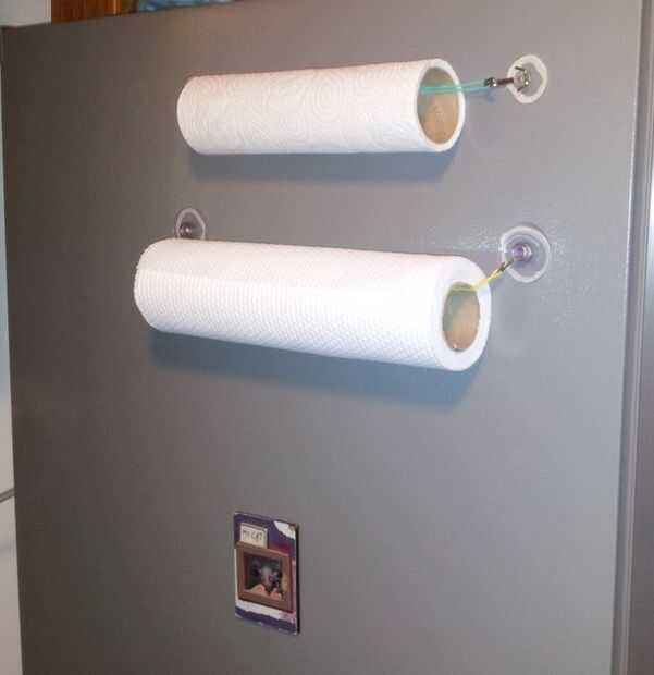 Use dos ganchos de pared y una banda elástica para sostener el rollo de toallas de papel en una pared, lado del refrigerador o puerta del gabinete.