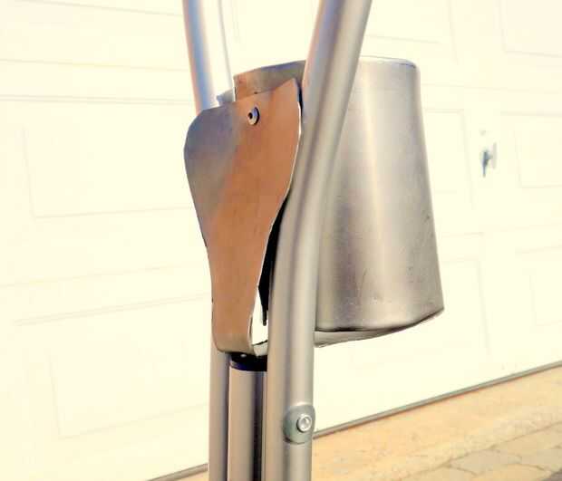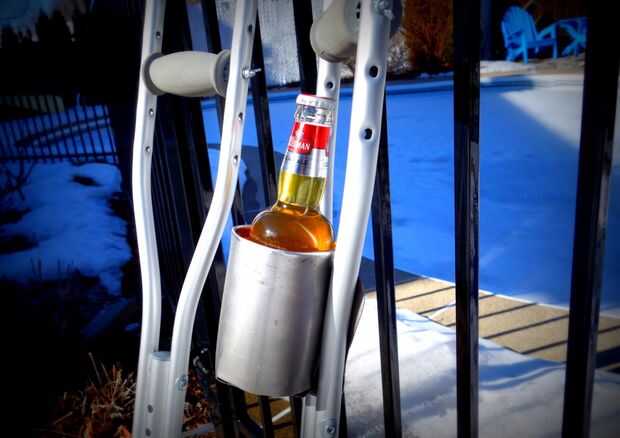 He roto por mi tobillo muy mal juego del hockey sobre y estoy tratando de adaptar a mi nueva realidad. Odio dependiendo de las personas para conseguir mi café caliente o una cerveza bien fría, así que ideé un portavasos extraíble para mis muletas. Diseñó a partir de una sola pieza de chapa y un remache, y estoy muy contento con el resultado.