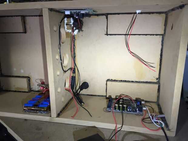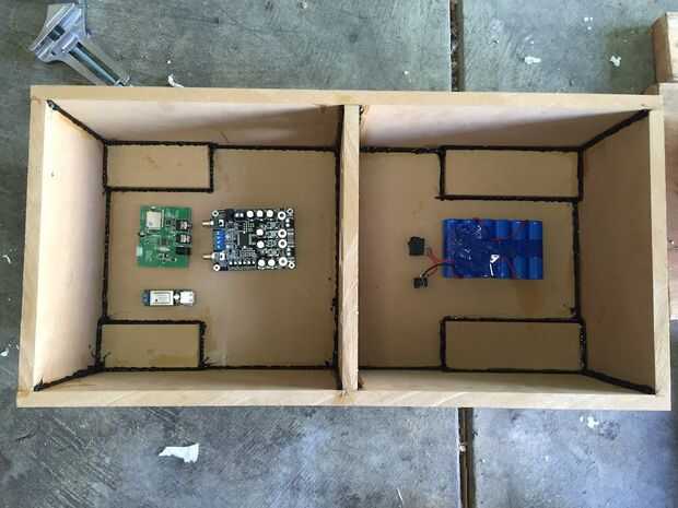 El amplificador fue colocado en la parte inferior de la caja, opuesta al lado de la batería. Lo colocó lejos de las paredes ya que necesitamos conectar los cables a ambos lados para entradas y salidas de altavoz.