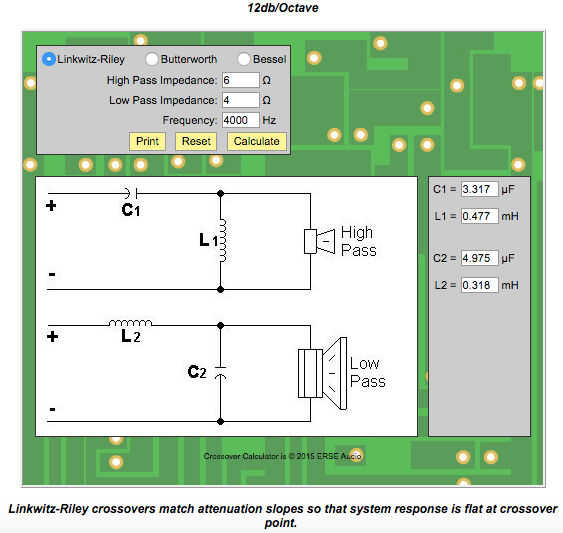Después de evaluar los objetivos de este proyecto, las capacidades de nuestros conductores dados y amplificador; Decidí implementar una red de cruce de Linkwitz-Riley de 2 º orden de alta calidad a 4kHz. El cruce de Linkwitz-Riley de 2 º orden tiene una pendiente de 12dB/octava respetable y le da una respuesta de frecuencia plana potencia en el punto de cruce, donde ambos conductores estarán - 6dB, minimizando la superposición destructiva del sonido.