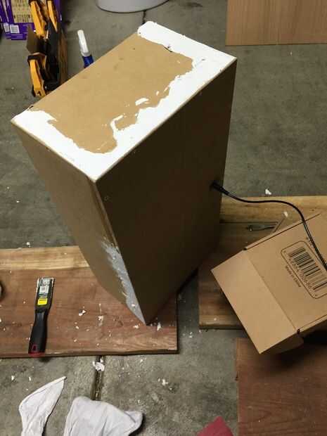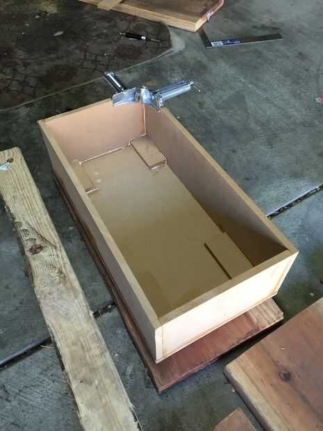 La construcción se hizo con pegamento de madera y algunos avellanados tornillos de 1-1/2"-#8 para la seguridad. abrazaderas de ángulo de 90 º y otras pinzas más grandes harán de esta todo mucho más fácil. Es importante tener muy lisas las superficies de ajuste porque queremos que esta caja al ser hermético al final. Preferiblemente será lograrlo con la madera y el pegamento solo, pero por si acaso, se llevará un pase con silicona en el interior para estar absolutamente seguro de que hemos hecho una adecuada caja sellada!