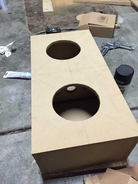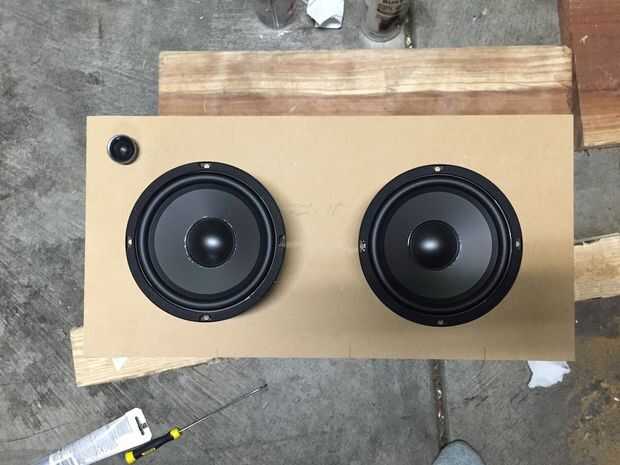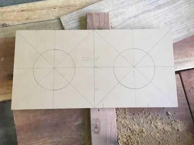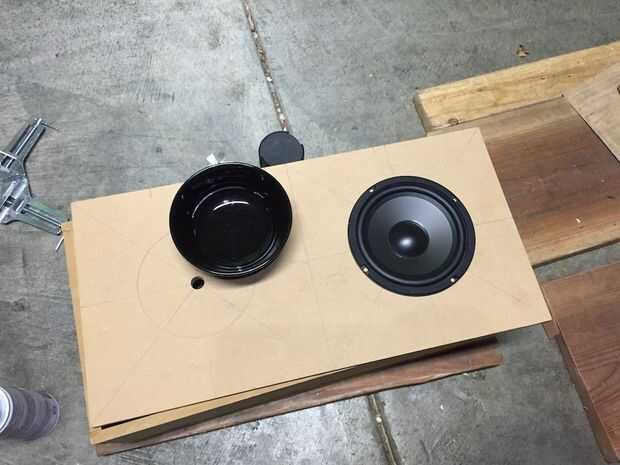 Colocación de los controladores era probablemente la parte más directa de todo este proceso. Quería que los lados izquierdo y derecho a ser simétricos, o al menos equidistante del centro. Los tweeters cerca del woofer, pero más lejos entre sí (en vez de ambos en el centro) de montaje para facilitar la separación estéreo y coherencia. Esto pondrá a prueba su círculo haciendo habilidades y tuve mucha suerte de encontrar un plato en mi casa que era el diámetro de corte del woofer perfecto :)