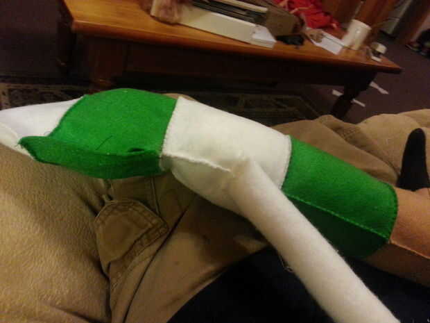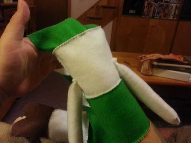 3. con el mayordomo de menta, cosí las piernas con una costura en el centro de las rodillas. El Sr. CC podría haber usado algunas rodillas.