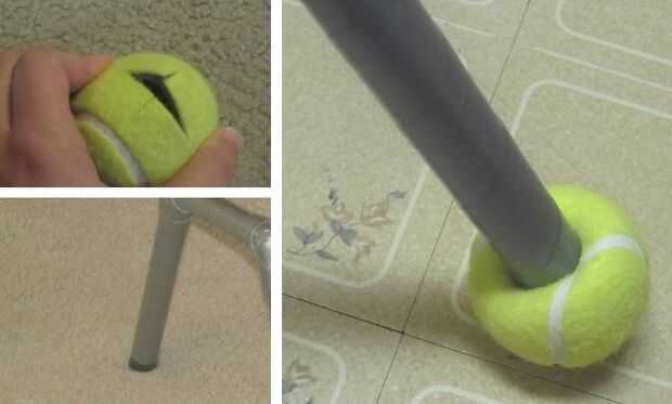 Si lo desea, puede Agregar pelotas de tenis a todos de las piernas. Usando un cortador de caja, realizar 2 ranuras en la pelota de tenis para formar un signo más o una "X". Pop la bola en la parte inferior de la pierna y listo! Usé 2 pelotas de tenis viejas que encontré en un armario, por lo que no les figura en mis gastos. Poner pelotas de tenis en las patas delanteras, pero ya que las patas traseras estaban en ángulo, yo simplemente les cubrió con alguna cinta adhesiva negra para hacer una tapa falsa. Ambos están en la foto.