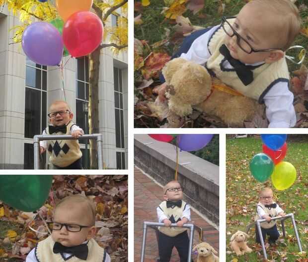 Usted puede vestir al niño en un traje gris que luce similar a Sr. Fredrickson, y si usted lo puede encontrar, más poder para usted! Pero ropa tipo abuelo va a hacer, y aquí es donde realmente puede personalizar el traje y ser creativo. Tomé un par de viajes a la tienda y encontró el perro peluche, una camisa blanca de botones, una corbata de lazo negro y gafas. El chaleco del suéter y pantalones de vestir azul ya tenía. Inicialmente pinté los cristales negros, pero la pintura mantenido saliendo en manos sudorosas del bebé, así que me quité la pintura y utilizar un marcador permanente (como otra idea, si no puede encontrar cualquier gafas, usted puede de la manera un par de limpiapipas negro borrosos). El costo total de todos los artículos de la tienda de segunda mano fue de $11. Compré 6 globos en Party City por $1 cada uno (puede además obtiene en casi cualquier tienda de comestibles) el día, porque el helio sólo tendrá una duración de 12 a 24 horas. Me ató los globos a un mosquetón y había enganchado a una presilla en la parte trasera de los pantalones.