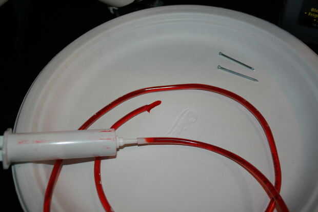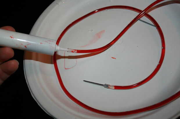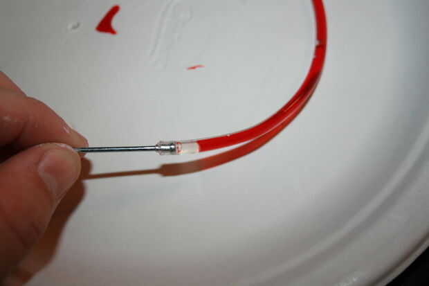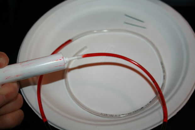 - Llene la jeringa e inserte en un extremo de un pedazo de tubería