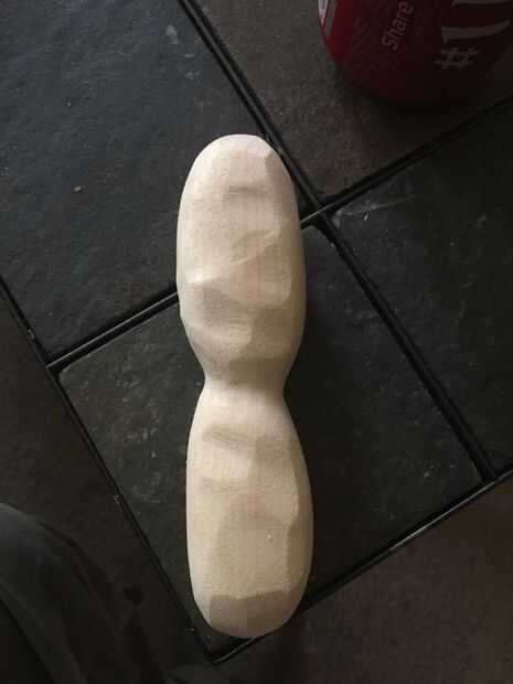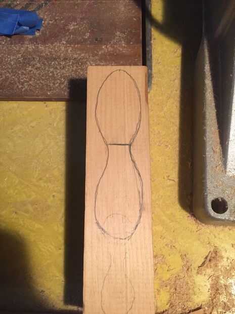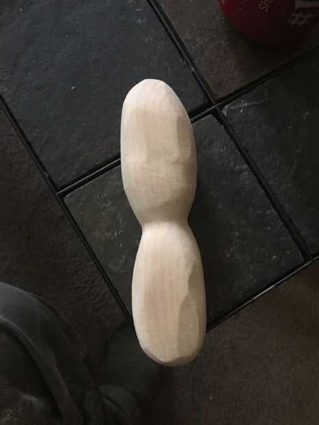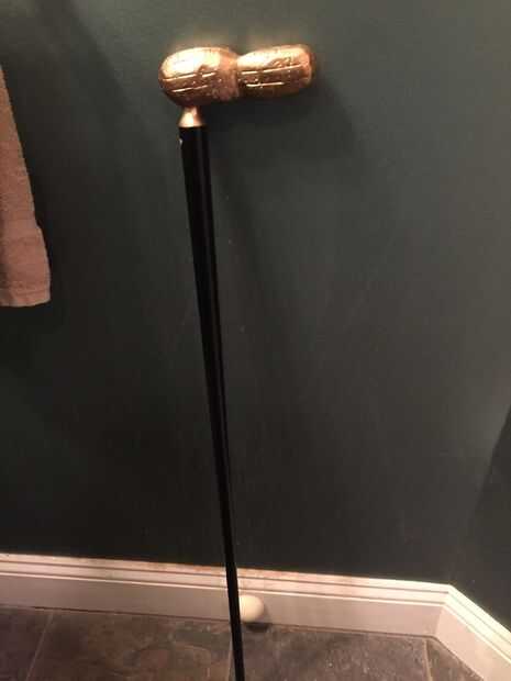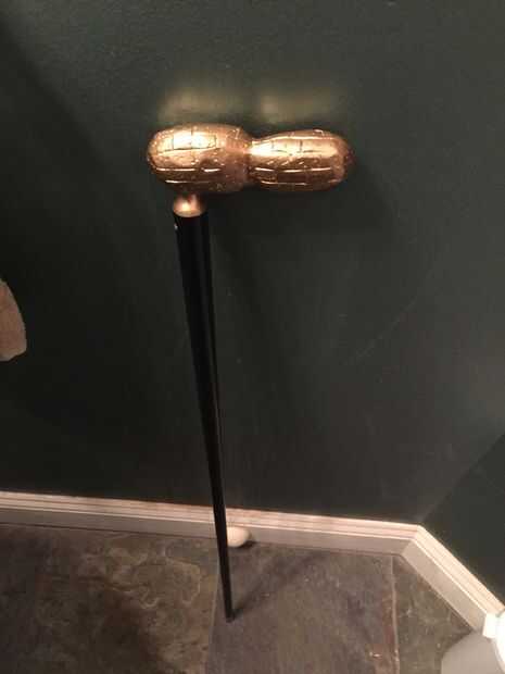 supongo que usted podría usar un bastón de almacén comprado, pero es divertido tomar el tiempo para tallar uno hacia fuera y pintarlo tú mismo. Usé una vieja señal de piscina y mide 33" de la parte inferior. Luego utilicé un trozo de álamo para cortar y tallar la forma de cacahuete.