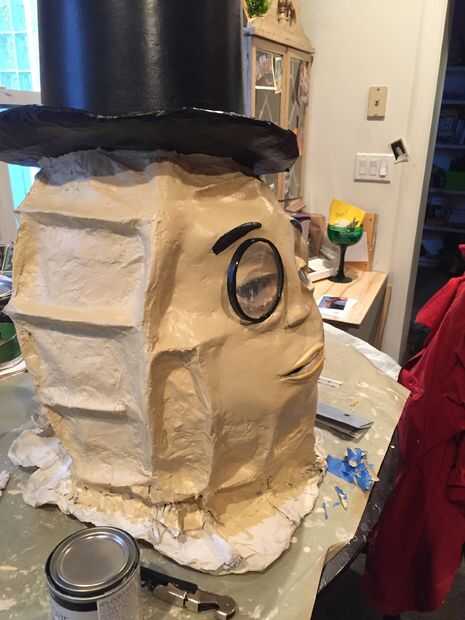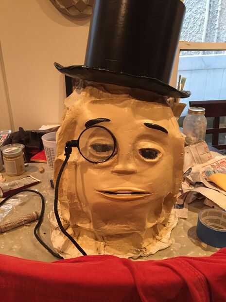Monóculo fue construido usando la tapa de una lata de Pringles. Ajustaron un codo de plomería al lado y equipado de 1/4" pieza de cuerda a él. Luego todo fue pintado negro.