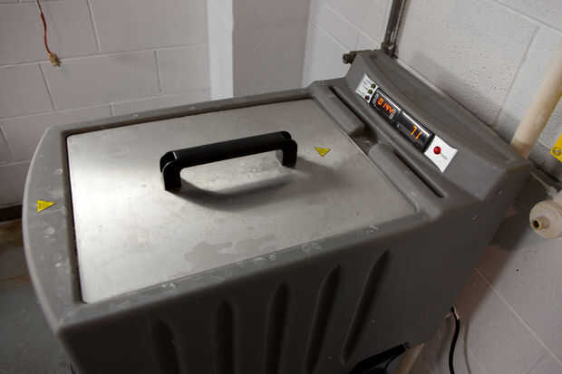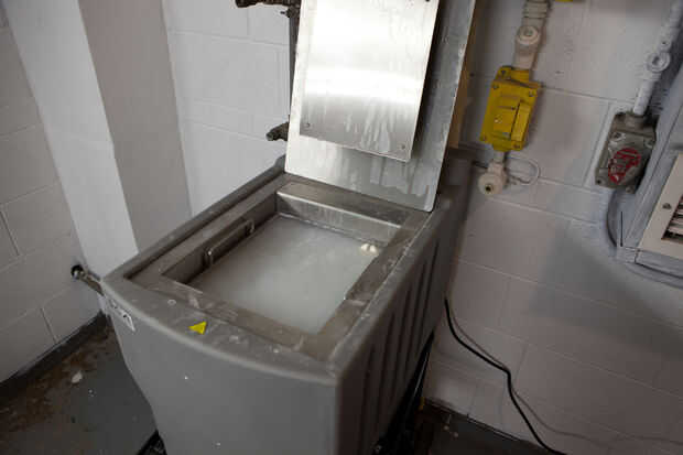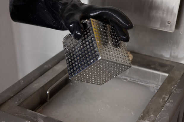Luego, fue a través del proceso que básicamente desolves de lavado innecesario material de apoyo del modelo. En el caso de una pequeña parte, podemos usar jaula de acero para no perder partes en ese tanque profundo lleno de jabón líquido.