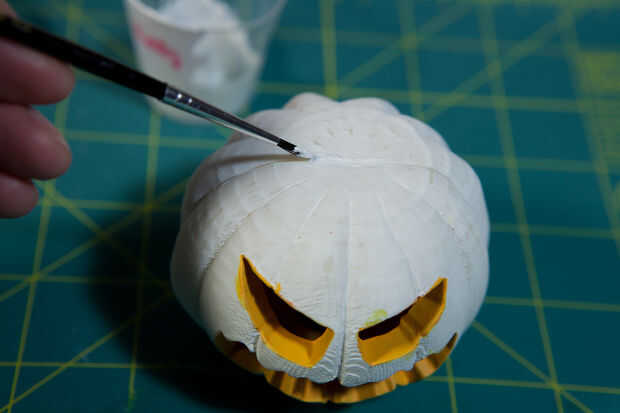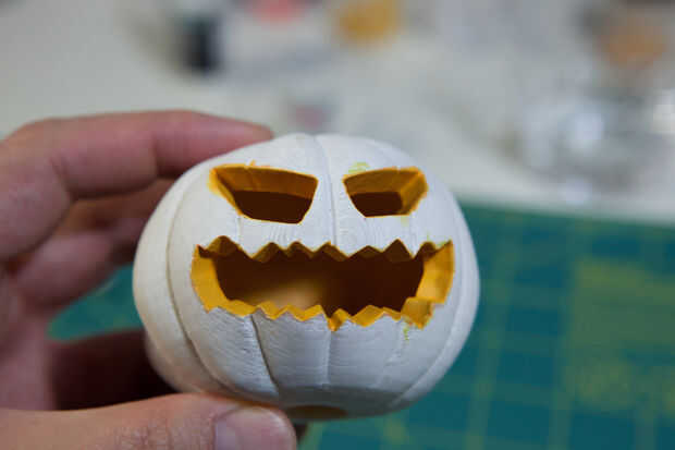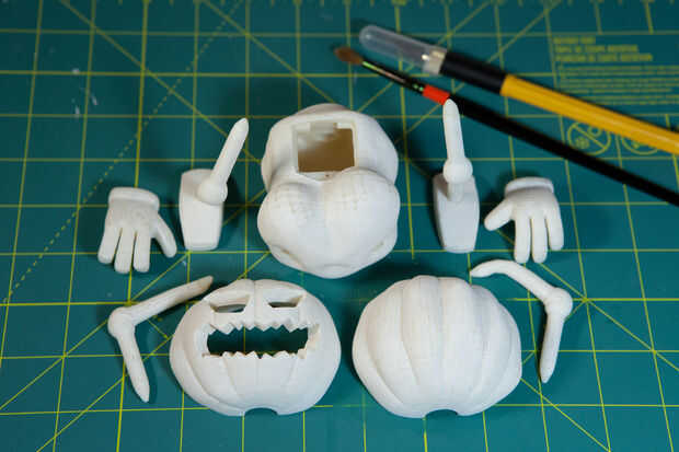 Se pegan dos partes del cuerpo (espalda y frente). Para piezas cabeza calabaza, pintado interior con amarillo primero y luego pegado.