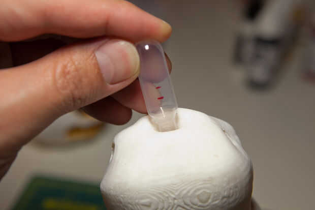 El tamaño de la pipeta fue un poco más pequeño que un agujero en la cabeza. Así, ha añadido algunos Masilla epoxy alrededor para hacerla más estricta.