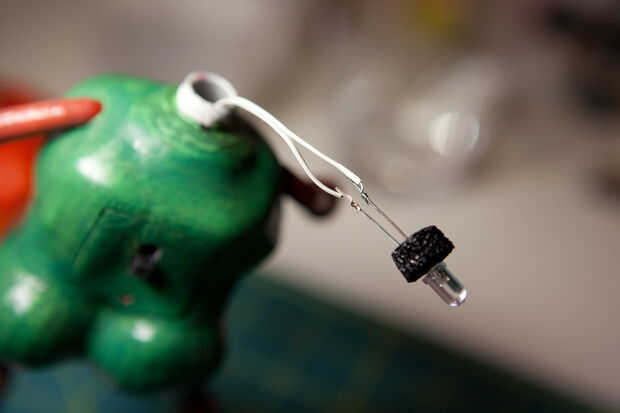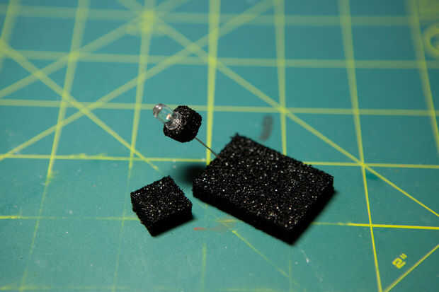 Para insertar LED tubo cuello de pipeta de plástico, utiliza esponja negro que encontré en mi caja de herramientas del circuito que viene con un pequeño IC componentes. Corte redondo para caber dentro del tubo e insertado LED conduce a través de él.