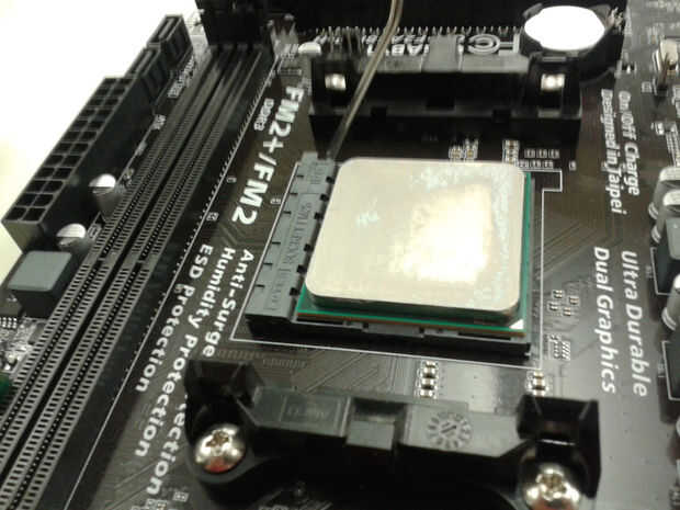 Comenzaremos añadiendo una CPU a la placa base. No hay ninguna fuerza a aplicarse hacia abajo de la CPU ya que debería encajar en lugar por cuenta propia una vez alineados. (Nota: Asegúrese de que si tienes un AMD subes la barra metálica antes de insertar la CPU.)