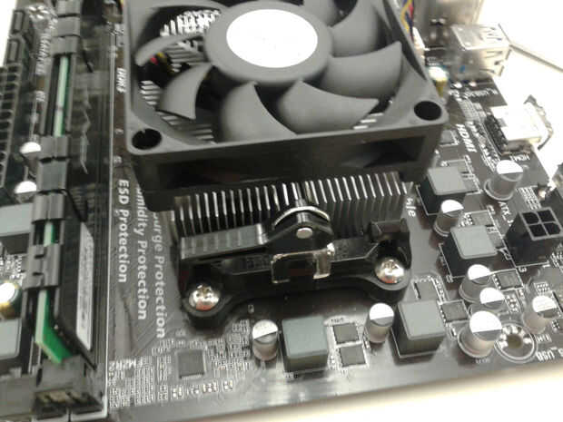 Ahora que la CPU se hace que necesitamos una manera de enfriarla. Asegúrese de que hay nueva pasta térmica antes de agregar el ventilador. Entonces al poner el ventilador en utilice la palanca para bloquear el ventilador en su lugar en los dos bordes de plástico. Luego enchufe el ventilador en los pines de la placa base etiquetado como CPU fan.