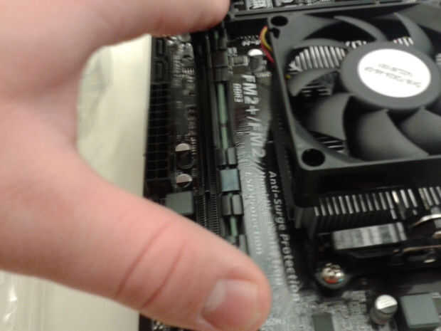 A continuación ponemos en un palillo de la memoria ram. En el tirón del puerto de RAM los dos brazos atrás e Inserte la tarjeta de memoria RAM. Se necesitan abajo presión o su no va a ser fácil. Una vez hecho el palillo de la memoria ram que oiga un clic. Empuje los brazos hacia atrás para anclar en el lugar.