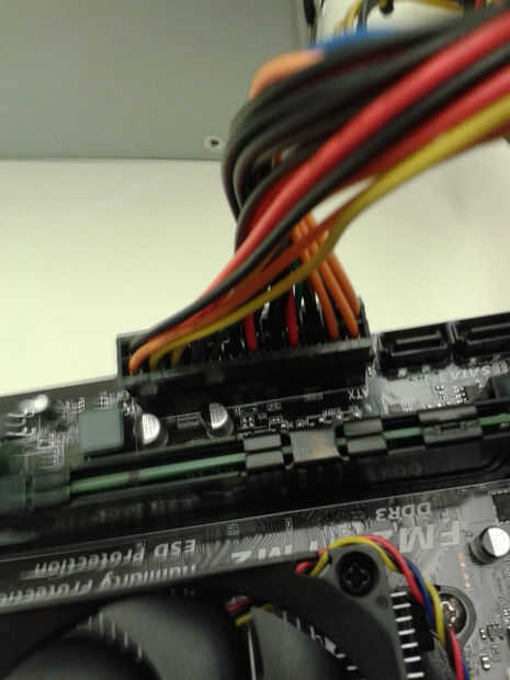 La fuente de alimentación tiene muchos cables por lo que esto puede ser confuso. los cables que vamos a usar son los 24 pines y 4 pines cables una vez que los traslado a un monitor y encienda por cortocircuitos en los pinos de dos interruptor en el tablero de la madre. un pitido y una advertencia de disco duro no es una buena señal de que todo está trabajando hasta ahora.