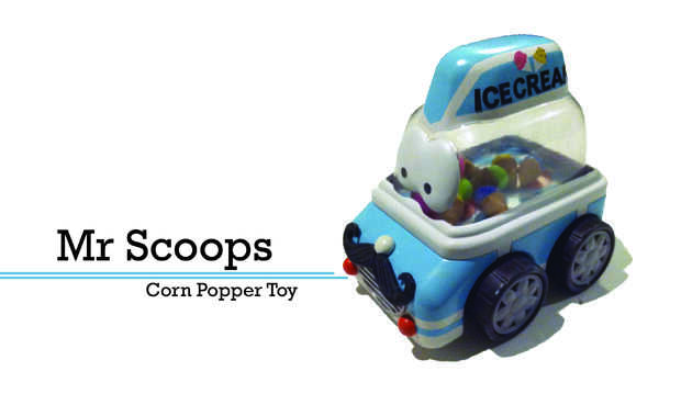 La ideación de las espuelas de juguete originario de juguete Fisher Precio maíz Popper , que utiliza una técnica de empuje que causa un movimiento estallido de las bolas de plástico dentro de la cúpula transparente. Tomé el mecanismo del juguete original y cambiado el diseño de forma de cúpula de los Popper maíz añadiendo un carácter 'carro heladero' más amable y amigable para los niños.