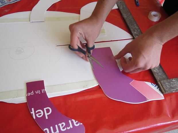 2. pegar las piezas de cartón con cinta adhesiva y hacer el esqueleto en sus propios pies.