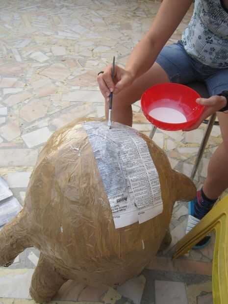 6. a lo pintan con los deseados colores aplica otra capa, esta vez.. .made de bandas de periódico que hemos aplicado con cola blanca.  Aplique otra capa gruesa de pegamento blanco después de usted termine con las bandas de periódico y espera paitently hasta que esté completamente seca.