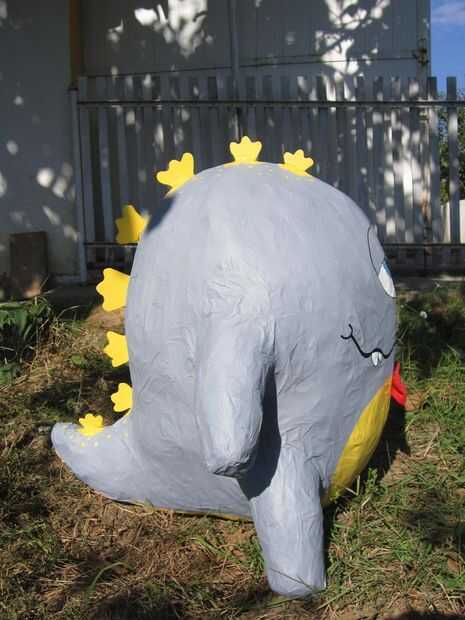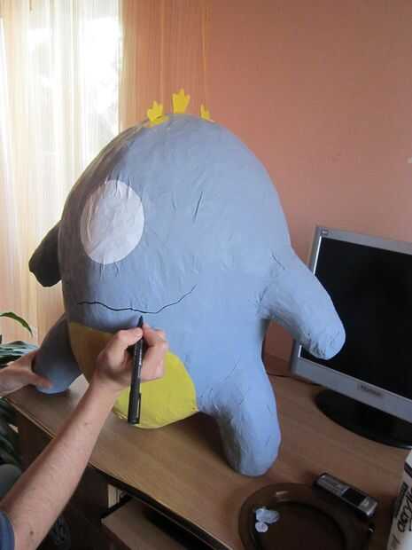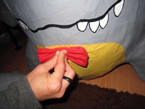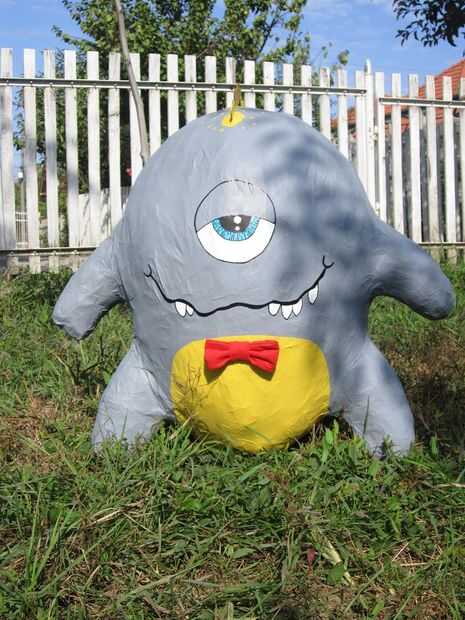 7. ahora tienes un monstruo casi terminado-buddy que espera para conseguir unos ojos, una sonrisa y algunos de nuevo puntos en caso de que mirar un poco más fearce (hicimos las espigas fuera de una caja de pizza)