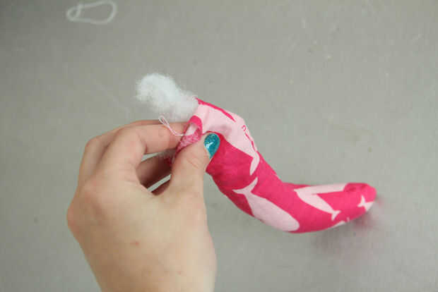 • Gire las patas dentro y rellenar con el relleno de fibra.  Dejar aproximadamente 3/4" de la pierna sin llenar.