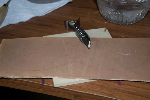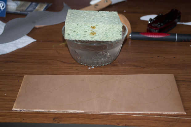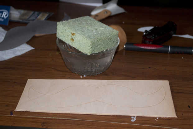 antes de iniciar el mecanizado o diseño sobre la piel debe estar húmeda. dependiendo de donde vive u puede variar en cuanto más húmedo es necesario para el cuero. la regla general es conseguir el cuero húmedo pero no empapado, debe star para doblar en la mano pero no mucho. Ahora haz esponja correr por todo el cuero y haz agradable y húmedo y esperar 2 o 3 minutos para que pueda empezar a cambiar a su color original antes de pasar al siguiente paso.