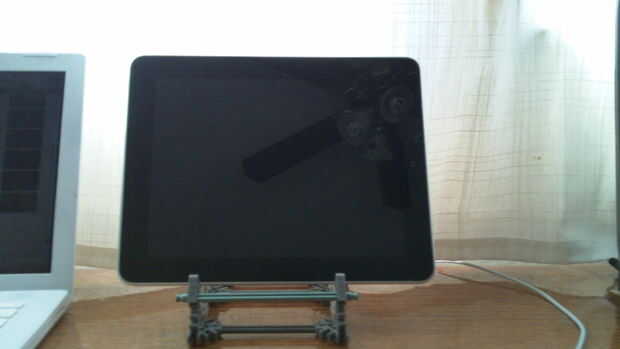 esto es una buena alternativa a todos los grandes y torpes soportes para ipad.Me tomó menos de 10 minutos y 2 herramientas para hacer este eleganteLo que usted necesita:x un Ipadx 3 mm de espesor Plexiglasx una sierra de calarx una pistola de aire ca