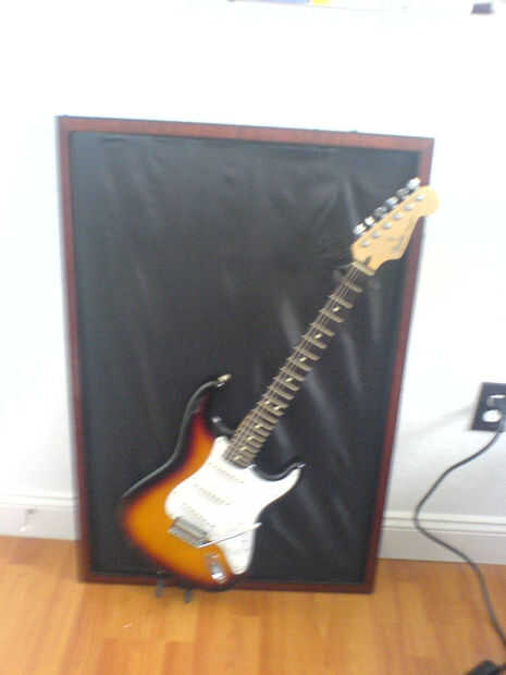 Antes de hacer un soporte de PVC vi este instructable, pero no quería taladrar agujeros enormes en mi muro. Tengo un cuadro grande de una tienda de trapo que salió de negocio, un tablero de clavija y dos perchas de herramienta de algunos negro tela de Wal-Mart y Home Depot. El resultado fue marco en la primera foto. Creo que parecía agradable, pero me gusta practicar casi a diario más que yo quería mostrar mi guitarra así que me mudé el stand de PVC, que hace mi guitarra un poco más accesible. Sin embargo, si usted tiene más guitarras para mostrar que to jugar y no tienes una pantalla personalizada para ellos, podría funcionar para usted.