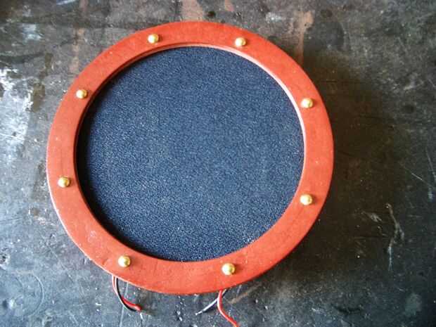 De Vulcanfiber I un anillo cortado y pegado algún paño debajo para cubrir los altavoces. El anillo fue pegado sobre la madera redonda.