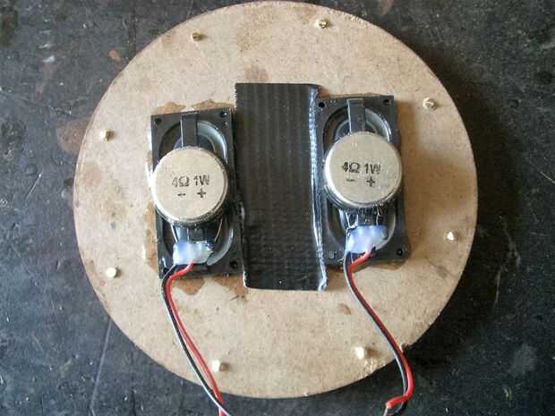 Yo corte una paz redondeada de madera con dos orificios para los altavoces y había pegado a los altavoces en él.