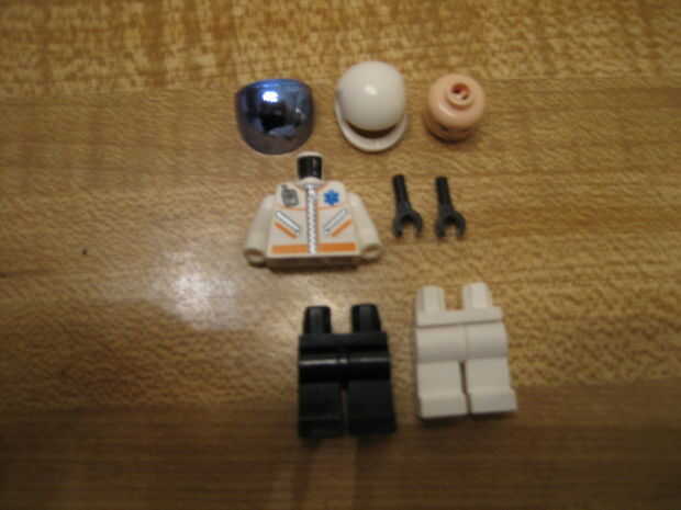 Necesita una cara de Lego, un casco blanco, una visera azul brillante para el casco, un torso de color blanco, patas de color blanco, patas de color negro y un par de manos negras.