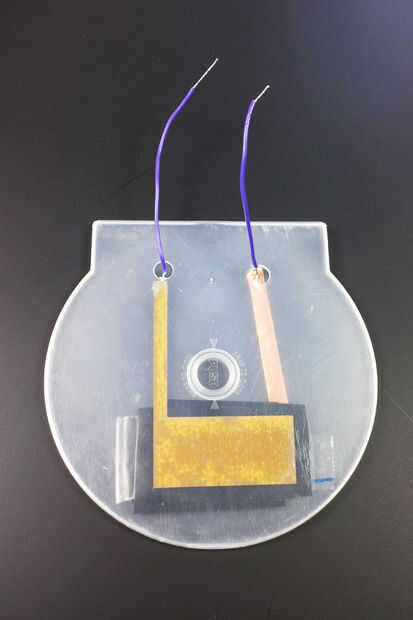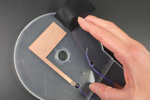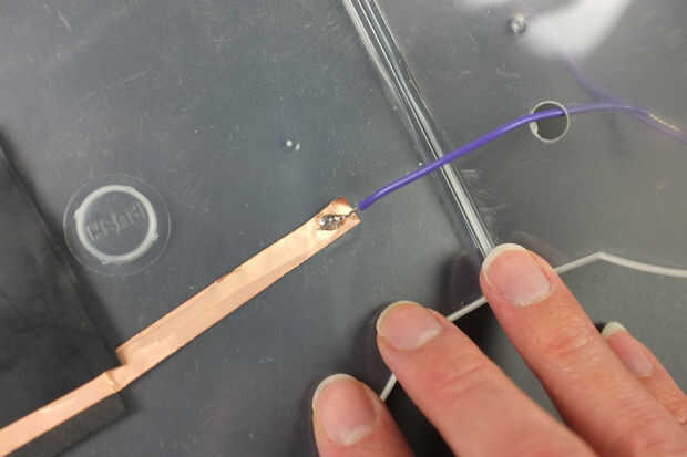 Los cables se sueldan a dos piezas idénticas en forma de bandera de la hoja de cobre pegado en el interior de la caja (en los lados opuestos). Cuando el caso está cerrado, las "colas" de papel de extienden por lados opuestos, no tocar (muy importante).