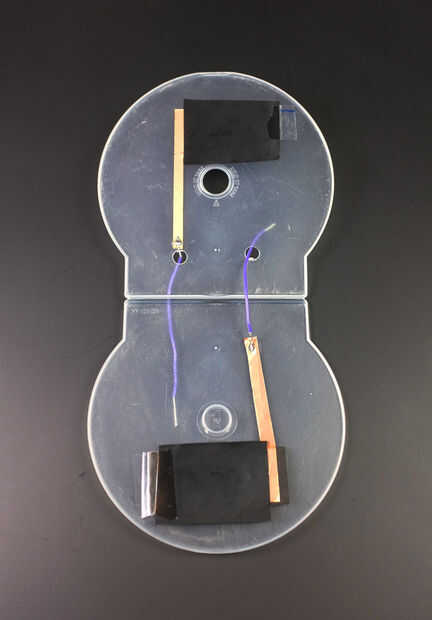 8. utilizar cinta transparente pegar un rectángulo de velostat sobre cada lámina.