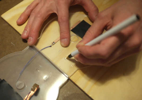 Dan primera marcó el punto medio de la madera a lo largo de un borde y alinea el punto medio de la coraza con. (Éste ya tenía un hoyuelo handy en el punto medio). Abrió la cubierta, por lo que el lado con dos agujeros en contra la madera, luego marca los agujeros en la madera.