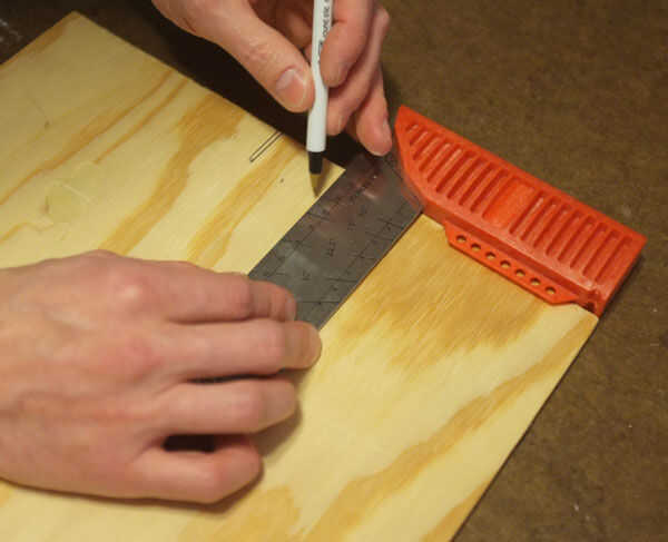 Con una regla cuadrada, dibujó líneas paralelas de los agujeros en el borde de la madera. Las líneas indican "canales", sólo lo suficientemente amplio como para el cable en.