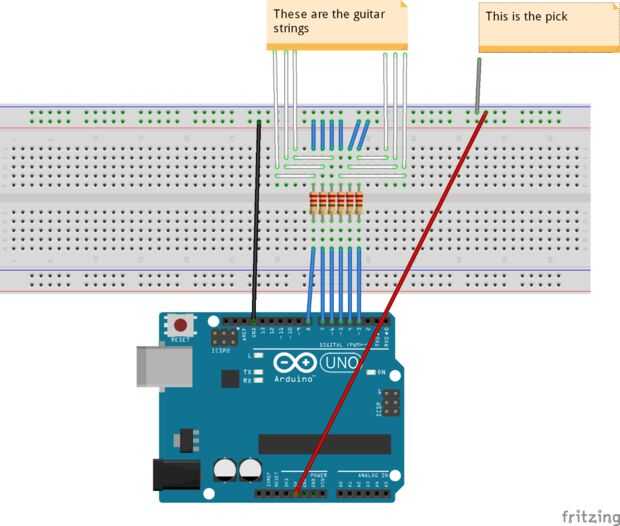 En principio, el circuito es muy simple - Arduino contiene seis interruptores hechos de alambre de cobre. Cada entrada digital es un resistente hacia abajo dando un 0 entrada D3-D8. Cuando la púa/pick hace contacto con el cable de cadena, esto completa un circuito para la entrada a 1.