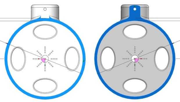 Aquí se puede ver el diseño CAD... y como se puede ver un lado de esta parte tiene una extensión redondeada mientras que el otro lado es corte plano.  La superficie plana es la parte inferior de la estructura para que todo comienza de la "balsa" sobre la mesa de la construcción.  La caverna interior es el menor de los dos lados... esto es para que los hilos que caer no caer tan lejos... el cuerno del servo va pegado y atornillado al plástico sobre la superficie lisa para que todos que cosas desiguales no es problema para el funcionamiento de robots DAIR.