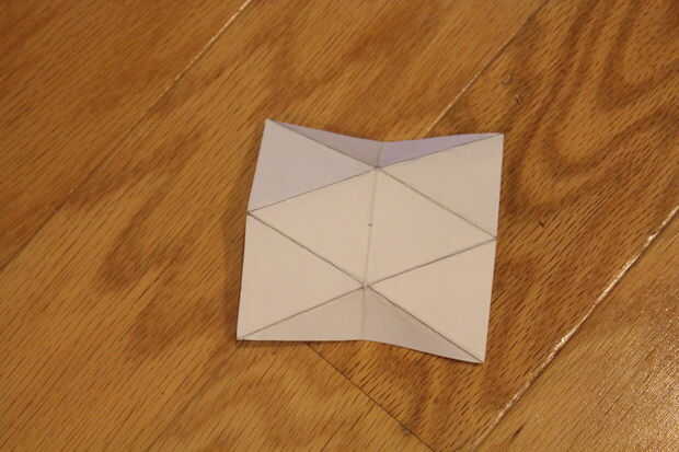 En primer lugar cortar un cuadrado de cartulina de 3 por 3 (Asegúrese de que es cuadrada) y dóblalo por la mitad. Hacer dos x que ajustan exactamente en cada mitad del papel, dejando el pliegue antes realizados en el centro de cada una de las plazas se dividen.