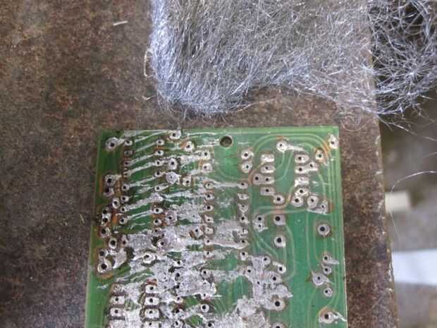 Ahora que todos los componentes se han ido, es hora de empezar a frotar la tabla con la lana de acero. Te darás cuenta de que la soldadura fundida exceso se quitará fácilmente; Si hay una gran gota que no sale, siempre puede calentar para arriba algunos más para que se funda y toque el lado de la Junta en la superficie de trabajo, que debe hacer el truco.