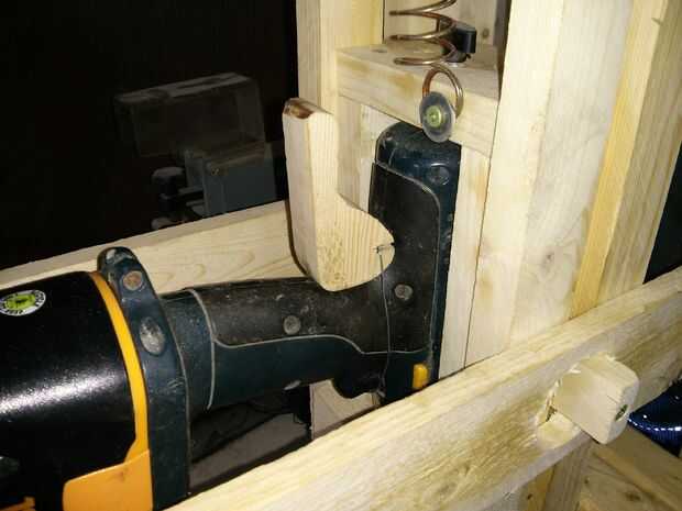 Como prometido, aquí es un diseño de interruptor de encendido rápido. Es básicamente un desplazamiento minúscula letra 'b' con un agujero perforado. Como veis en mi imagen había originalmente cortar una ranura para la correa de goma de la casa, pero encontró que un simple trozo de alambre trabajado mejor. Actúa como un palanca contra la ranura en el mango con el gatillo oprimido cuando usted baje y luego lo lanza como se levante otra vez.
