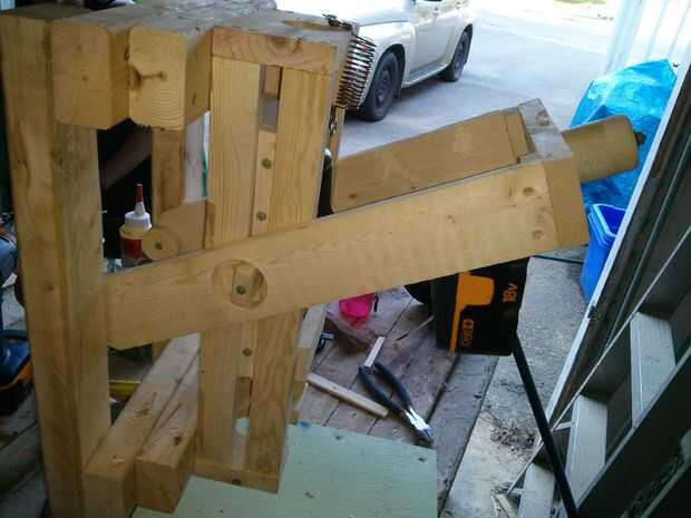 Los brazos de la palanca están hechos de 1/3 tableros, en rodajas de 1/2" ancho y corte a 16" de largo. Había ahusada que se monta en la base, pero no es un paso necesario ya que no afecta la operación de cualquier manera. 2" perforar un orificio es áspero 6 pulgadas del extremo del eje en cada tablero. Esta será la palanca para las 'alas' creado en la caja del taladro. Salvar el corte de los agujeros.
