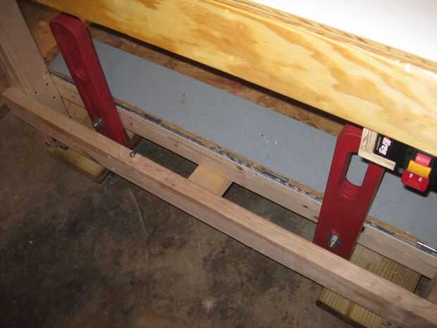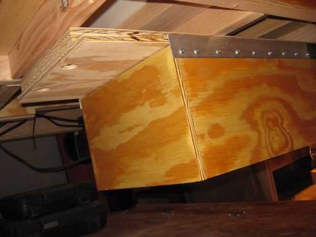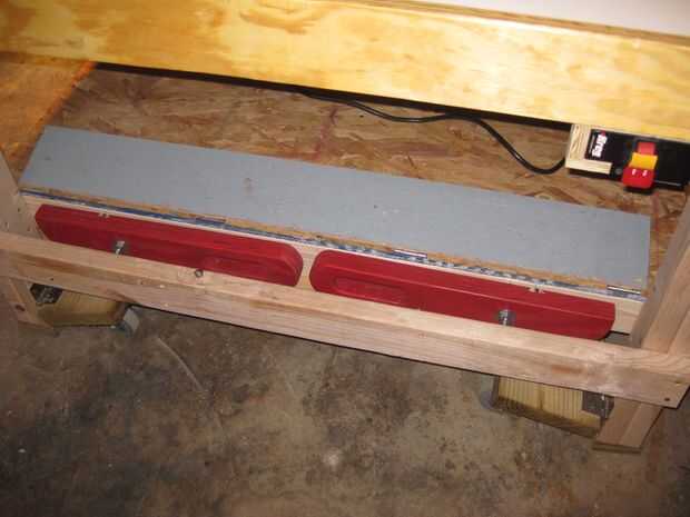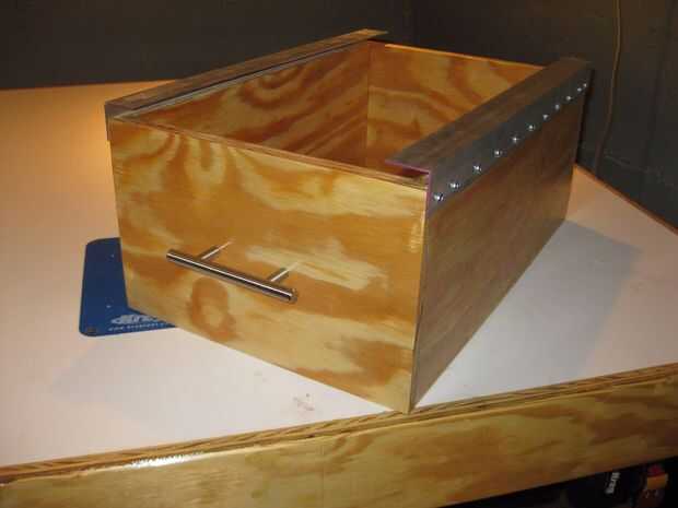 El cajón tiene stock de ángulo de 90 grados de aluminio a cada lado y se desliza sobre una pista de colgante, que se hace de la madera contrachapada de 3/4". La pista se hace formar tres capas de madera contrachapada para caer por debajo de los bordes de la tabla. La capa inferior es el mismo ancho del cajón, mientras que las capas de los dos primeros son xx... el espacio entre los rieles de aluminio.