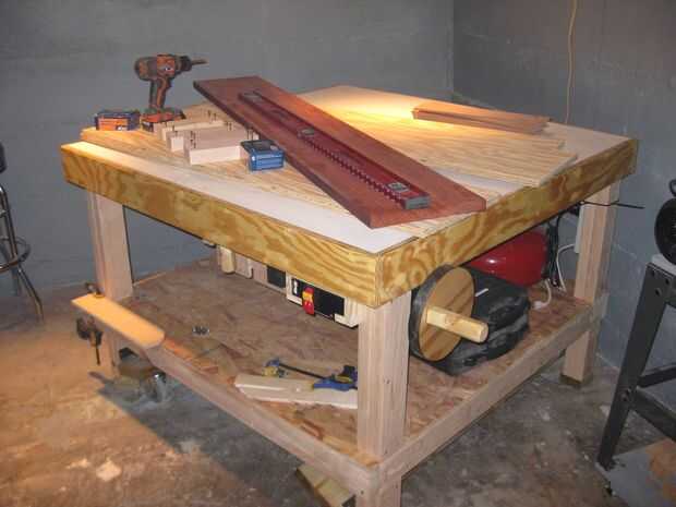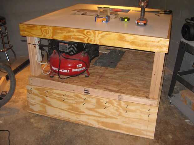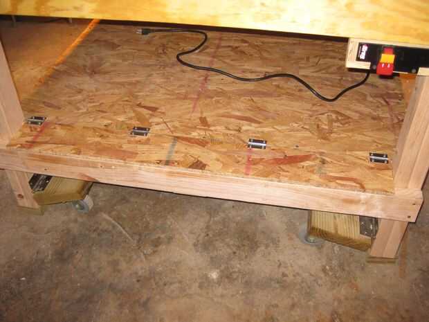Las patas de 2 x 4 expuestas parecía fuera de lugar, por lo que los envuelve con madera de desecho. Todos los filos de la madera contrachapada ribete/rodeo fue redondeado más con un router siempre que sea posible y con la mano cuando no es posible. Todos los agujeros se llenaron con masilla de madera y luego todo de la madera contrachapada y OSB fue terminado con 3 manos de poliuretano.