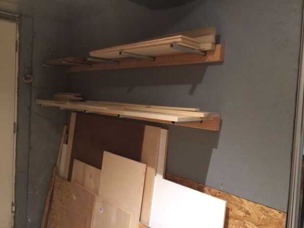 El estante de madera es una variación del de Jay Bate Estante de madera de conducto barato. Se hace de 2x4s y conducto eléctrico (EMT). Versión de Jay cuelga el 2x4s verticalmente en el borde, pero colgué mina horizontalmente en la cara. Lo hice porque el espacio detrás de la puerta es sólo de 18" de profundidad y método de Jays haría el espacio inservible de espalda 3 1/2". La orientación horizontal me permite maximizar la profundidad limitada.