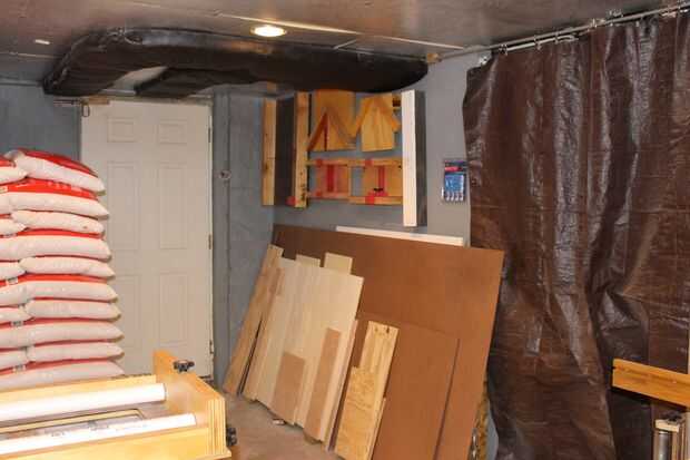Hasta este punto, Sierra trineos fueron almacenados en la pared detrás de la puerta, pero estaba quedando sin espacio y realmente quería usar ese espacio para un bastidor de madera de mi mesa. La pared estaba enmarcada en dos secciones separadas con 2x4s tratada a presión. La parte inferior va desde el suelo hasta la tubería 2" PVC polvo colección mientras que la parte superior rellena el espacio entre la parte superior del tubo y el techo. Un completo de 4' x 8' hoja de OSB envolturas del frente. La pared se atornilla a las vigas del techo, el OSB atados las secciones separadas por lo que son sólidos y no del peso realmente se encuentra en el tubo de PVC.