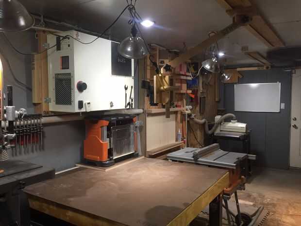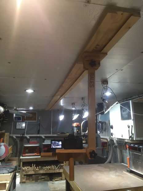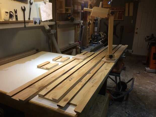 Versión 2.0 es sólo un simple hecho de madera contrachapada de 1/2" y emplea una cola de Milano deslizante. La pista principal hacia abajo en el centro de la tienda es de 16-17', hay una segunda pista por encima de la parte delantera de la tienda y entonces dos ejes estacionarios... uno por la madera del estante y uno por la tabla vio pared de trineo.