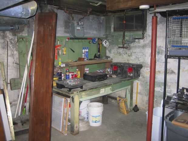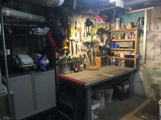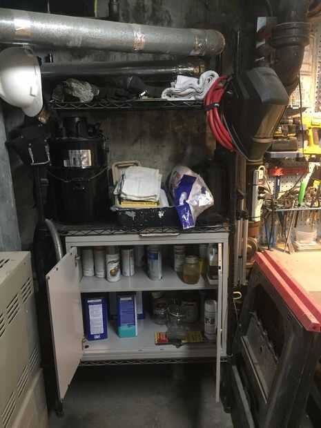 Al lado de la banca es un estante de almacenamiento de metal, que tiene bandejas de pintura, trapos y mis herramientas para limpiar mi estufa a pellet. En la parte inferior de ese estante es un gabinete metálico (rescatado de una oficina de cierre), que es donde almaceno la pintura de aerosol, las manchas y productos químicos... cualquier cosa inflamable básicamente.