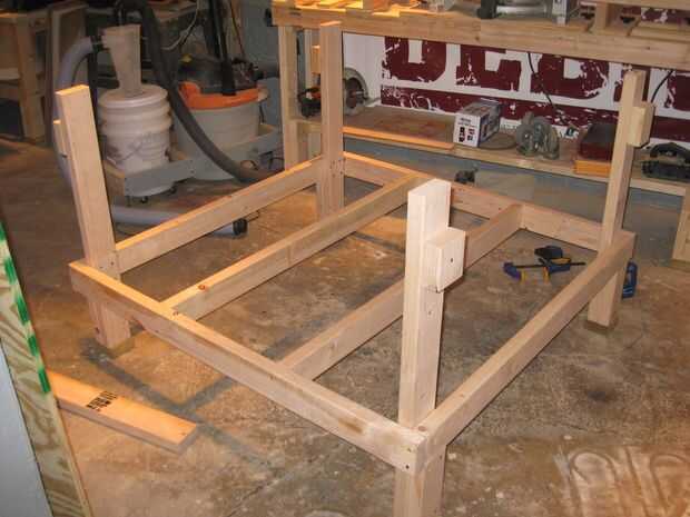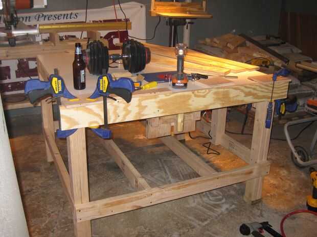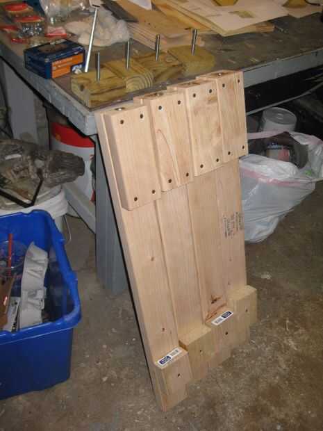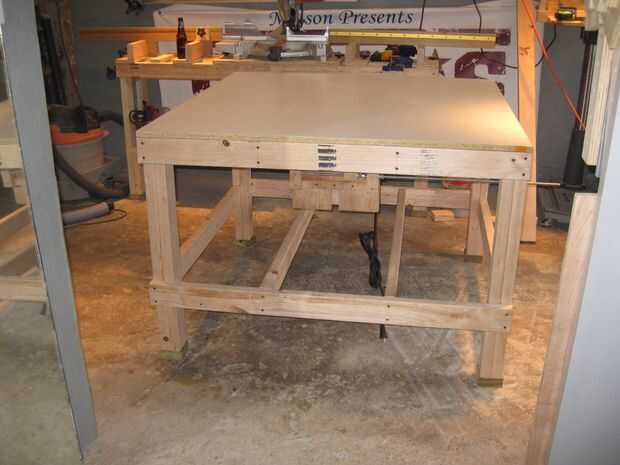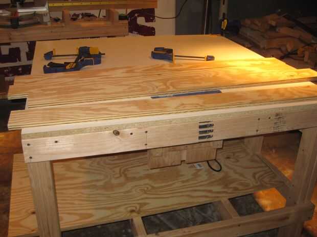 La cubierta inferior era un duplicado de la parte superior sin tener que preocuparse por el espacio interno para la elevación de router. Para las piernas, he usado la misma construcción como en la estación de Sierra de inglete y mesa baja... 2x4s con DIY patas niveladoras. Este tipo de construcción "laminación de 2 x 4" hace montaje muy fácil... especialmente cuando trabajan solos. Es como una versión más voluminoso de un empalme de media caña... sin el corte.