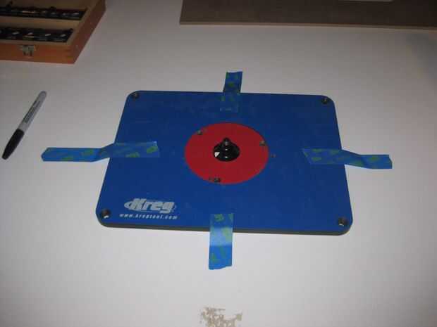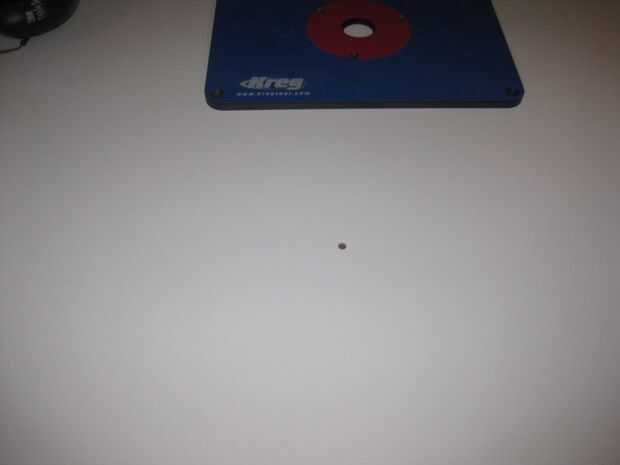 Para determinar la ubicación, fija la melamina a la mesa, utilizada el router una recta de 1/4" bits y utiliza el ascensor para levantar lentamente la broca a través de la mesa. Desde la cima de la tabla, pegó una ronda sobre pedacito en este agujero y coloque la placa de router sobre ella... buscador de punto centro de rápida y fácil. Entonces era sólo una cuestión de usar un cuadrado de la velocidad grande del borde delantero de la tabla a un lado de la placa para tenerlo sentado recto. La plantilla de cartón se deslizó alrededor de la placa y temporalmente se adhirió a la melamina con cinta de doble cara.